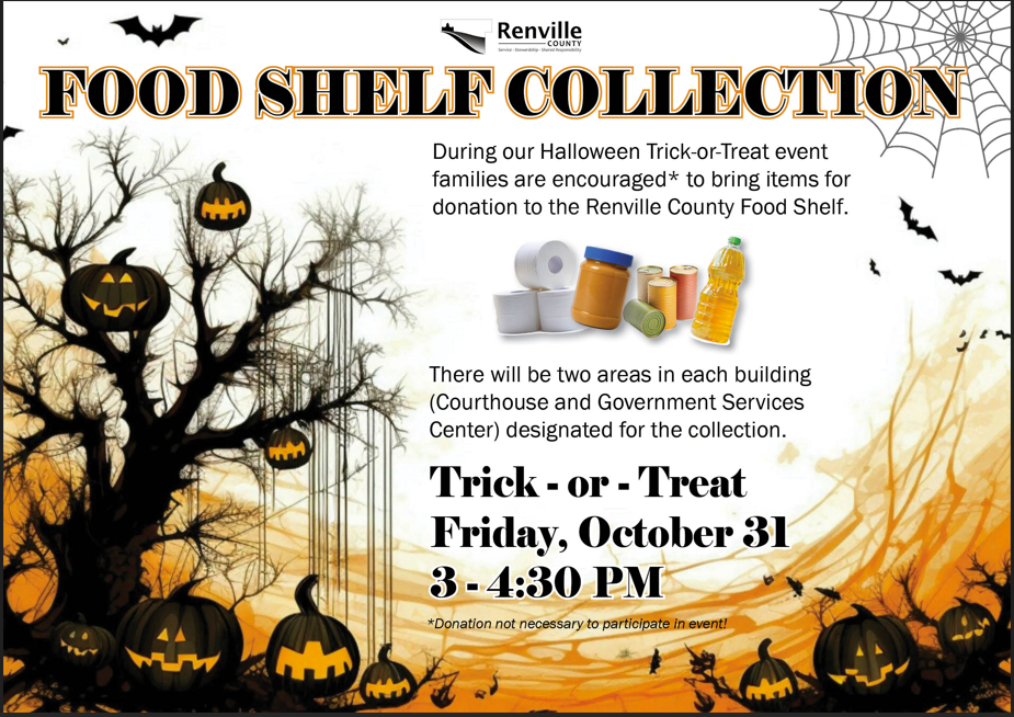 Stop by the Renville County Government Services Center and Courthouse on Friday, October 31 from 3:00 to 4:30 p.m. for tricks, treats, and fun! We are also taking this opportunity to collect donations for the Renville County Food Shelf. There will be two collection bins in each building. If able, please bring along an item or two that can help a family in need. *Donation not necessary to participate in the Halloween event.